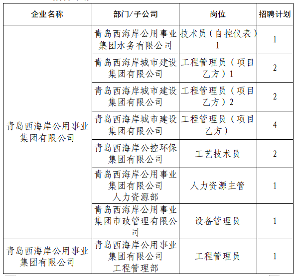 为满足集团业务发展需要,青岛西海岸公用事业集团有限公司现面向社会公开招聘工作人员26名,具体招聘公告如下: